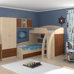 Набор мебели для детской комнаты "Соня" включает необходимые предметы обстановки для спальни двух детей. Такой уголок экономит пространство в детской комнате.